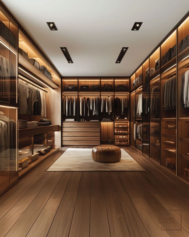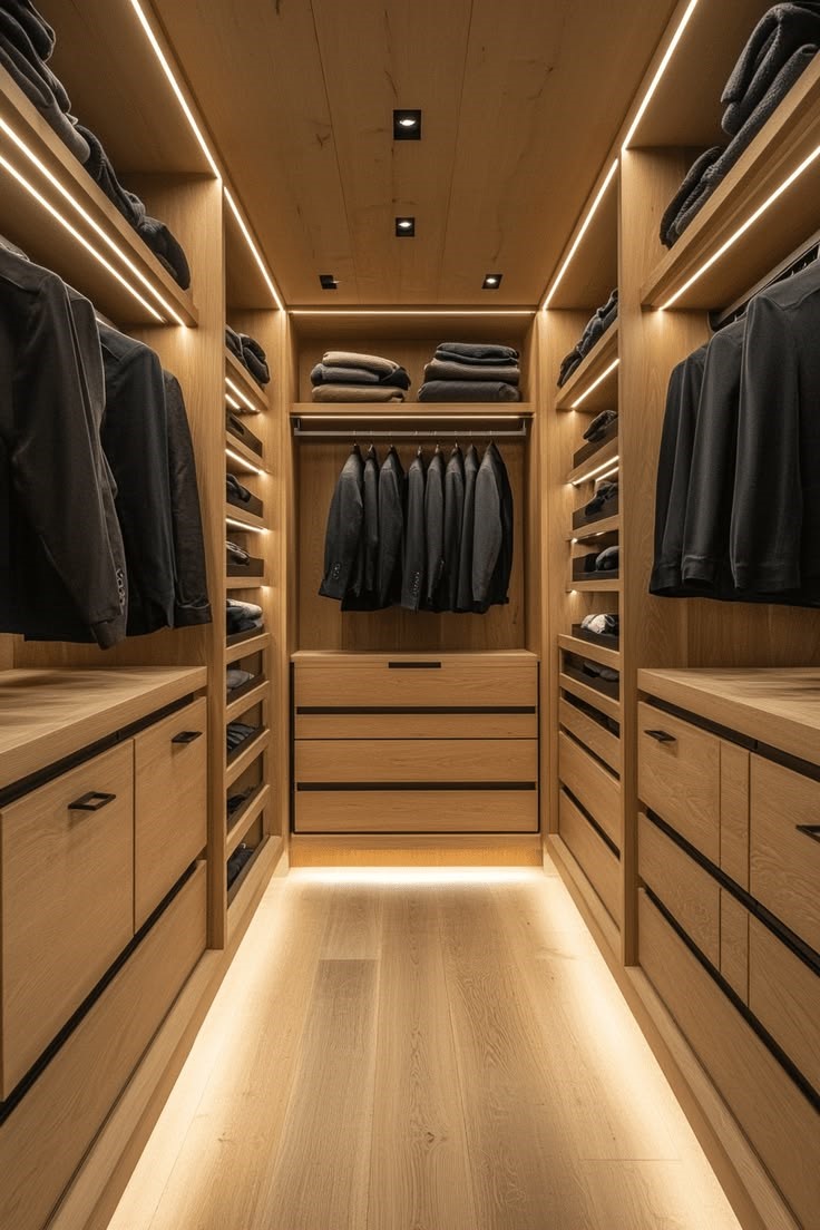 Lighting is fully integrated into the structure, with vertical LED channels and soft anti-glare diffusers that provide even illumination across all sections. Smart activation via motion sensors or magnetic triggers ensures convenience while enhancing the luxury feel.