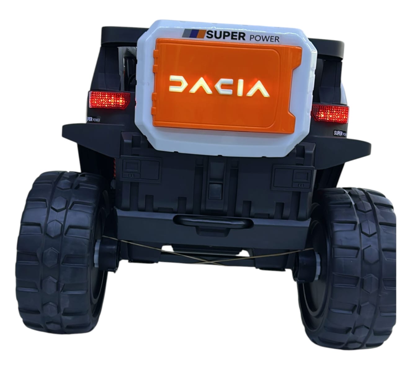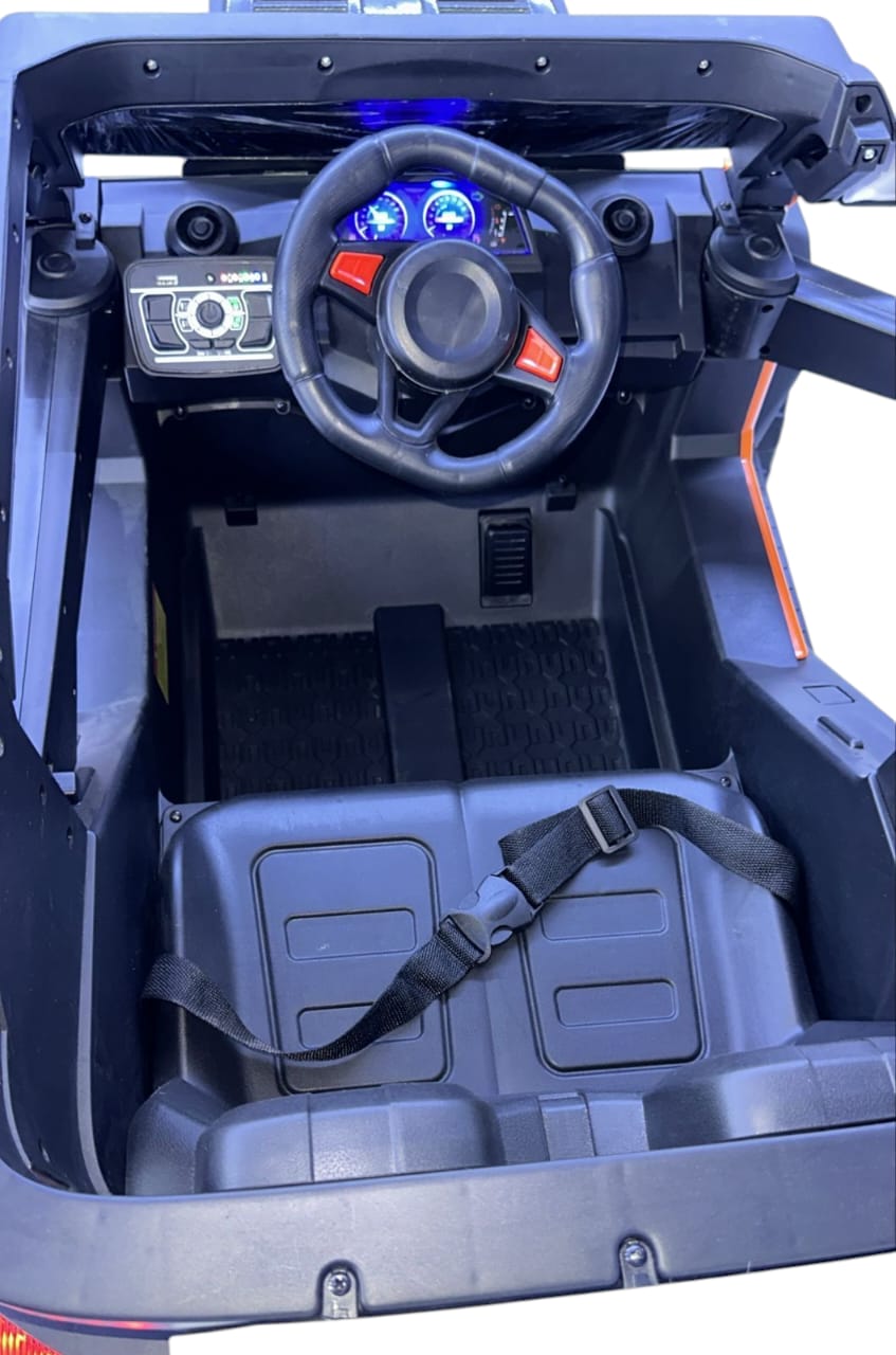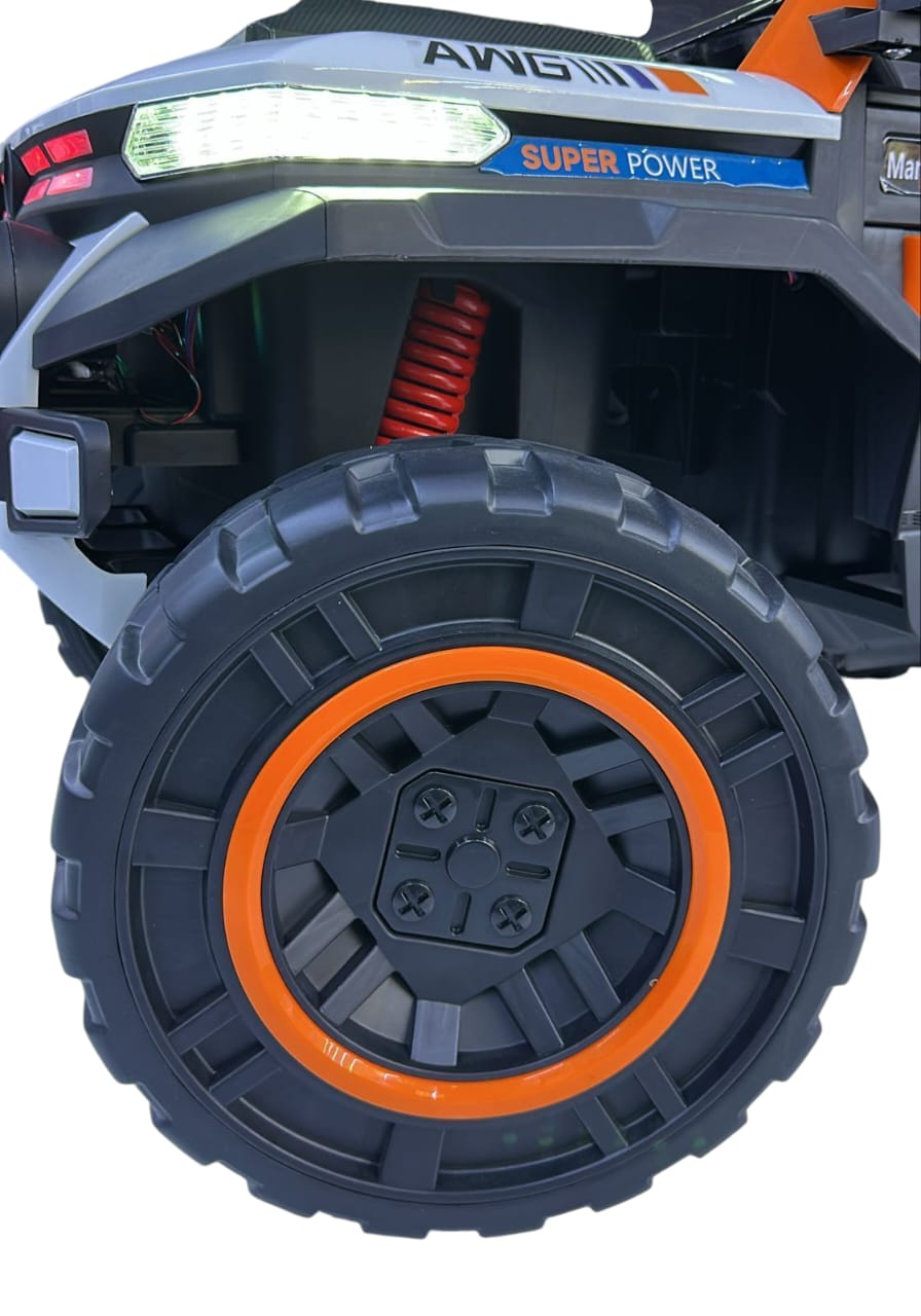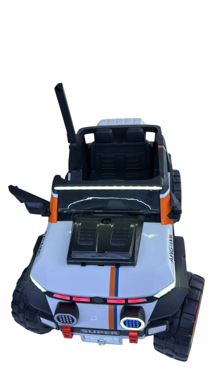 Designed for bold explorers, this electric kids’ jeep stands out with its rear spare wheel, top bar lights, and detailed multi-light setup. Powered by a 12V battery and 4-wheel motors, it offers both manual and remote control options. With rocking mode, volume buttons, and full lighting from front to rear, this is a high-performance toy built for fun, safety, and off-road style.