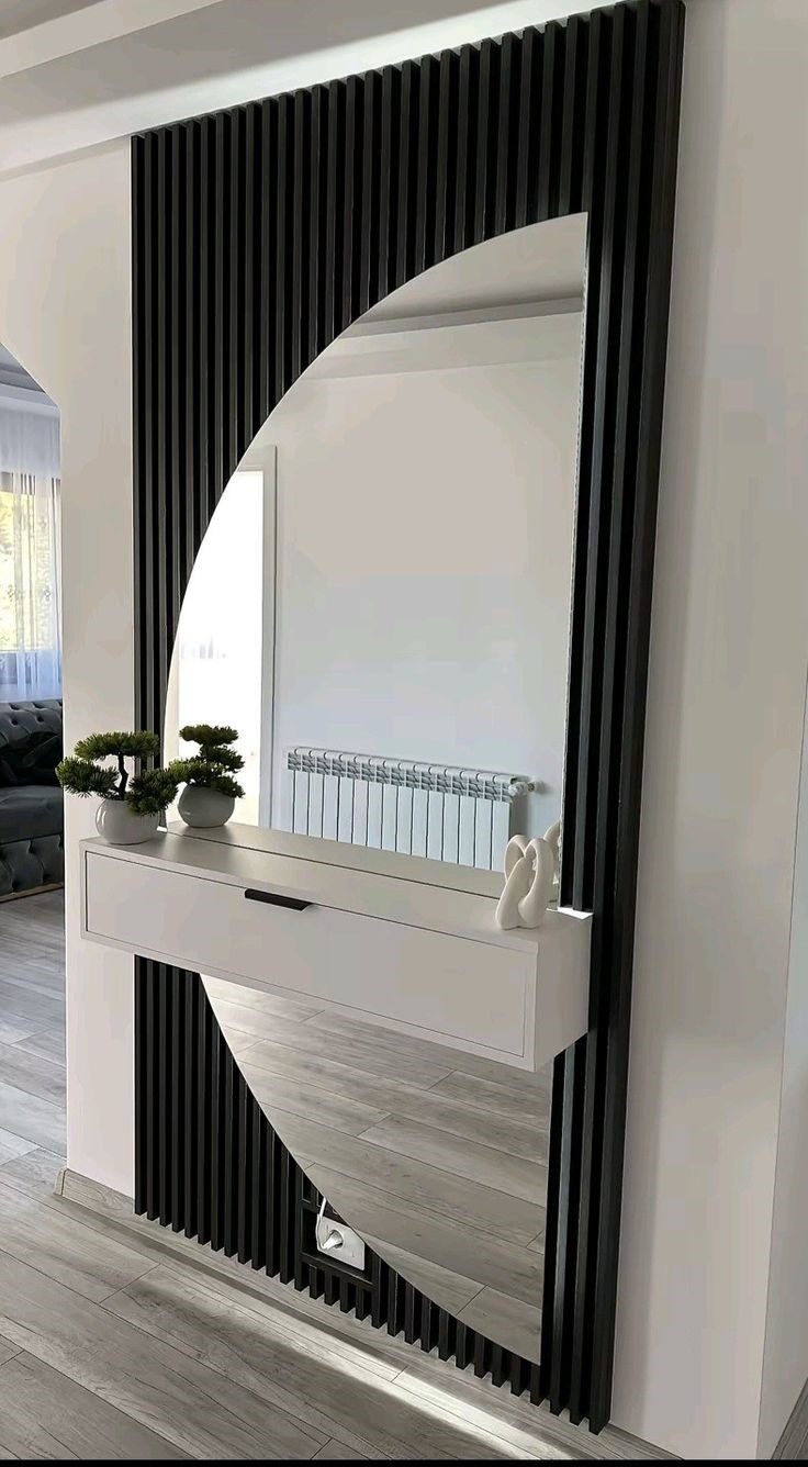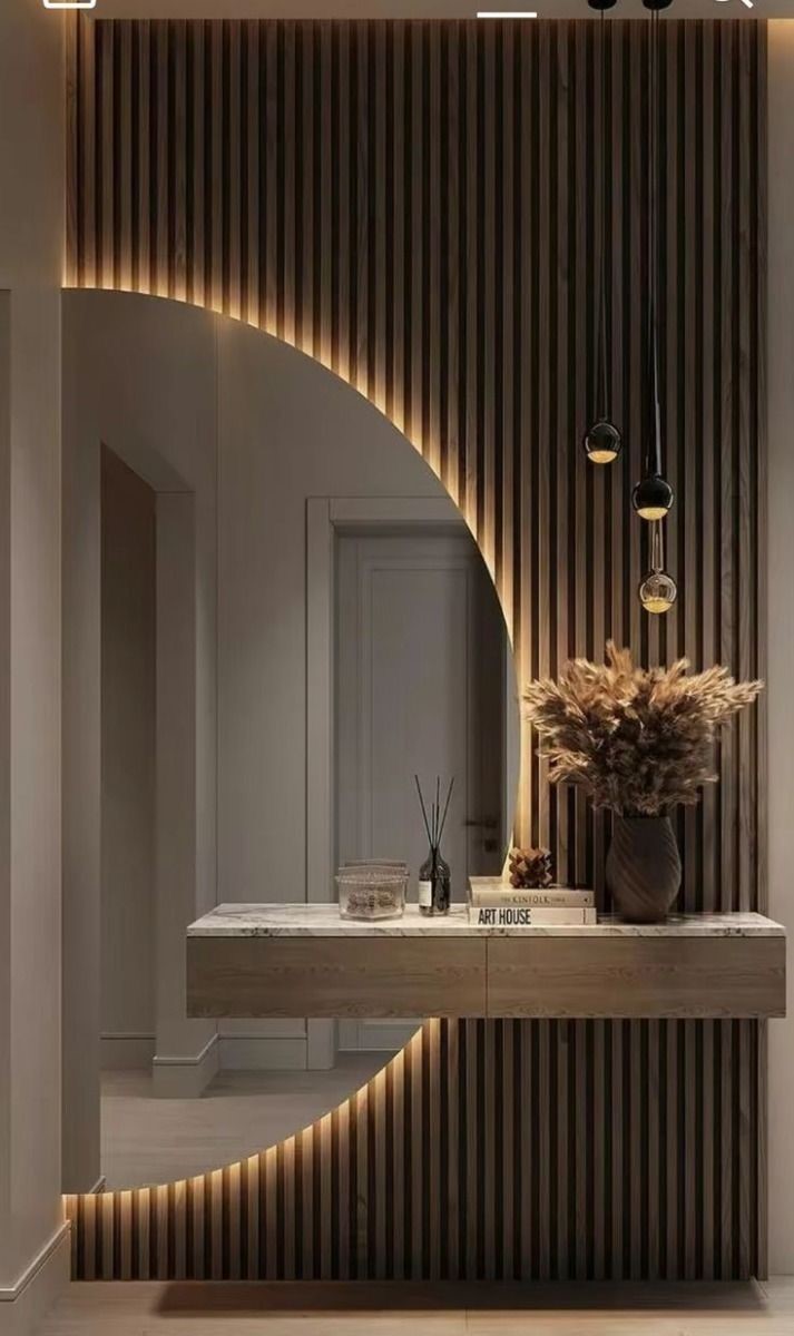 The design features a floating matte black console, paired with a vertical oak slatted backdrop and a striking half-moon mirror, creating a unique geometric composition that enhances both light and depth. The asymmetrical mirror placement adds a custom-designed look, making your entryway feel more spacious and visually dynamic.