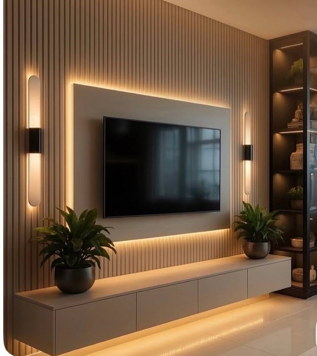 The design features a three-layer modular composition, including a fluted slatted backdrop, a raised central TV mounting panel, and a floating console unit, creating a sense of depth, symmetry, and visual balance. The vertical slats in warm taupe or greige tones add texture and acoustic benefits, making it ideal for premium living rooms in Dubai and Abu Dhabi homes.